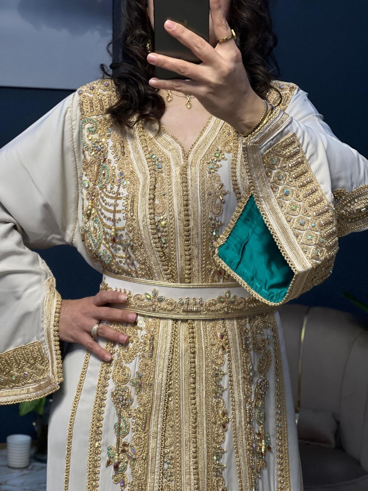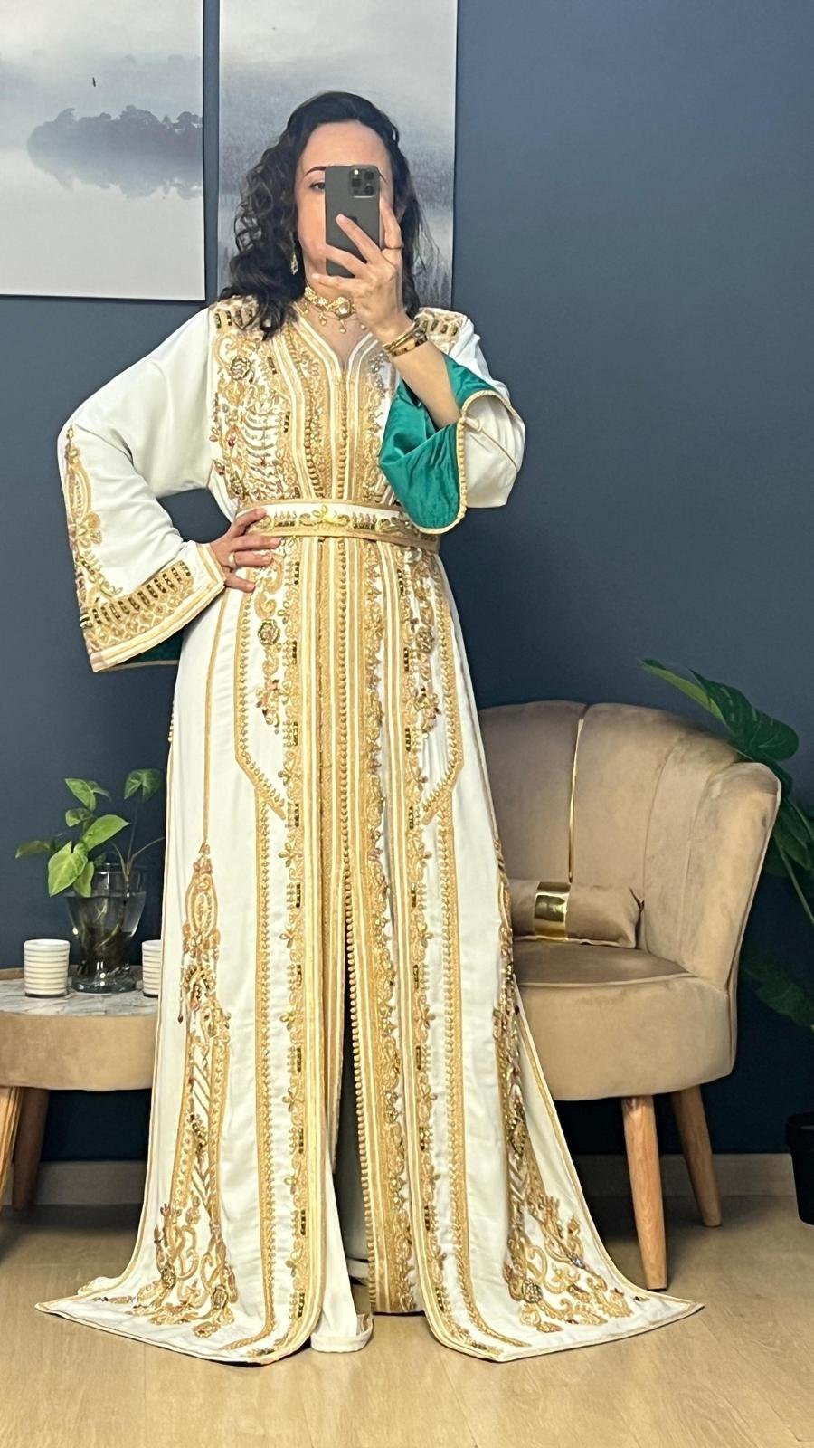 الخام كريب ناعم شك مع تطريز يدوي اللون ابيض وبطانه اخضر