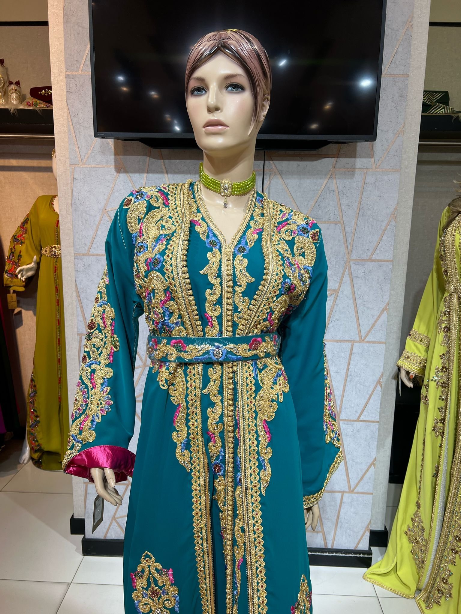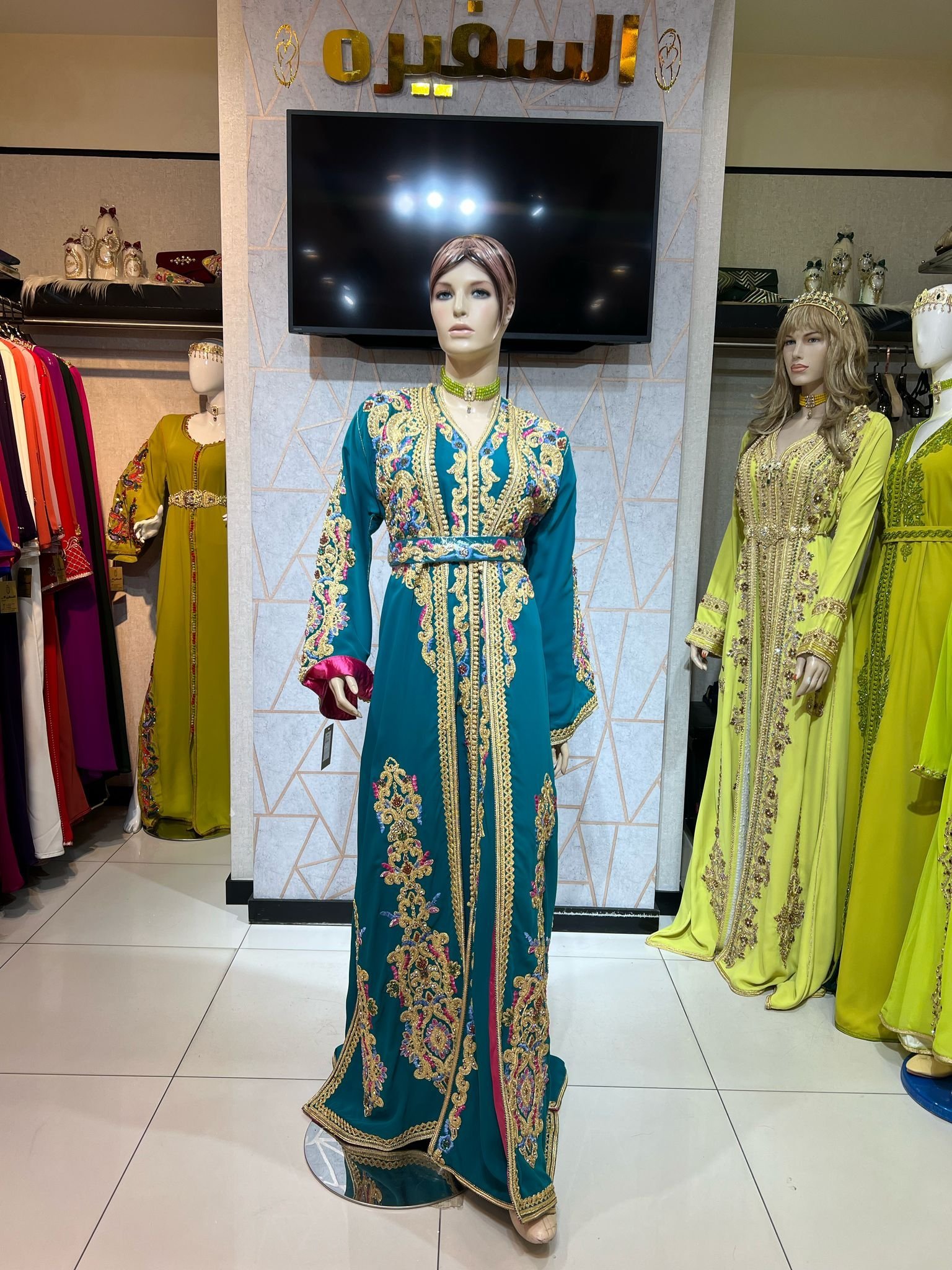 الخام كريب ناعم شك مع تطريز يدوي اللون تركواز وبطانه فوشي