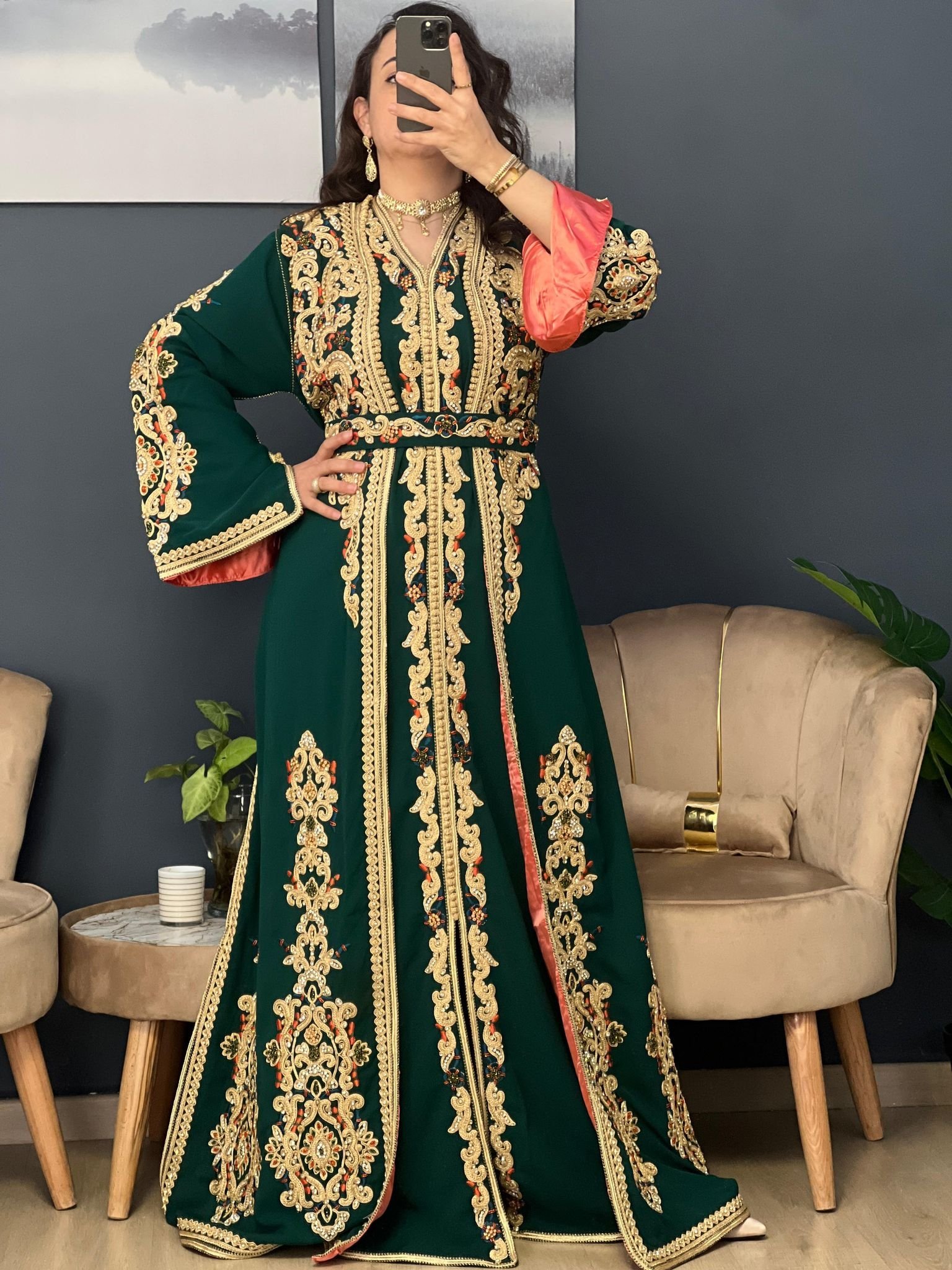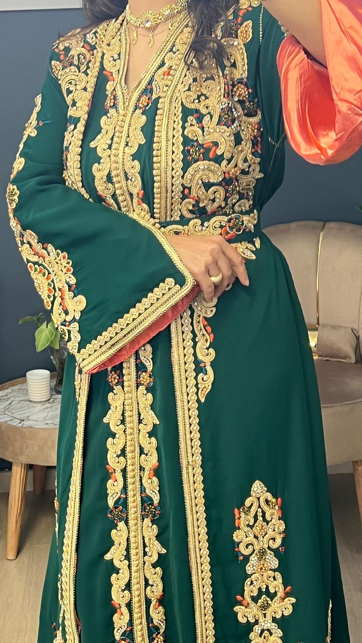 الخام كريب ناعم شك مع تطريز يدوي اللون زيتي بطانه اورانج